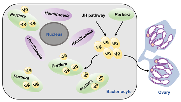 烟粉虱(Bemisia tabaci)是危害蔬菜等农作物的一类世界性重大入侵害虫。共生菌在烟粉虱危害成灾中起关键作用。栾军波课题组研究发现:一方面,烟粉虱保幼激素途径与共生菌Portiera能够调控卵黄原蛋白(vitellogenin, Vg)在含菌细胞内的表达;另一方面,卵黄原蛋白影响烟粉虱的产卵和共生菌Portiera的滴度。该研究揭示了卵黄原蛋白作为多功能蛋白,在共生菌融入到昆虫繁殖发育生物学中发挥重要的作用。研究成果拓展了对宿主与共生菌互作机制的理解,为粉虱的精准防控提供了新靶标。研究得到国家杰出青年科学基金、国家自然科学基金面上项目、辽宁省“兴辽英才计划”创新领军人才等项目资助。